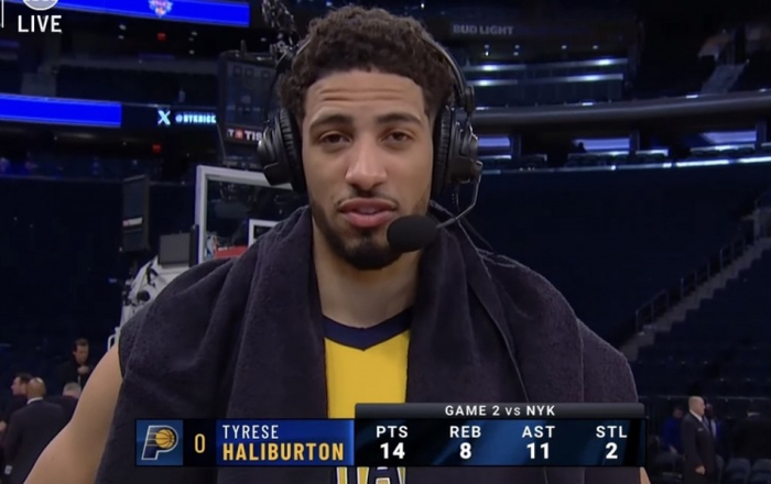 直播吧5月24日讯 东部决赛G2,步行者114-109力克尼克斯大比分2-0领先。赛后,哈利伯顿接受了采访。