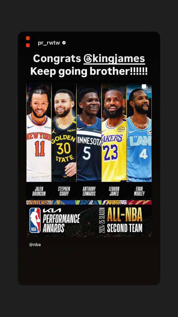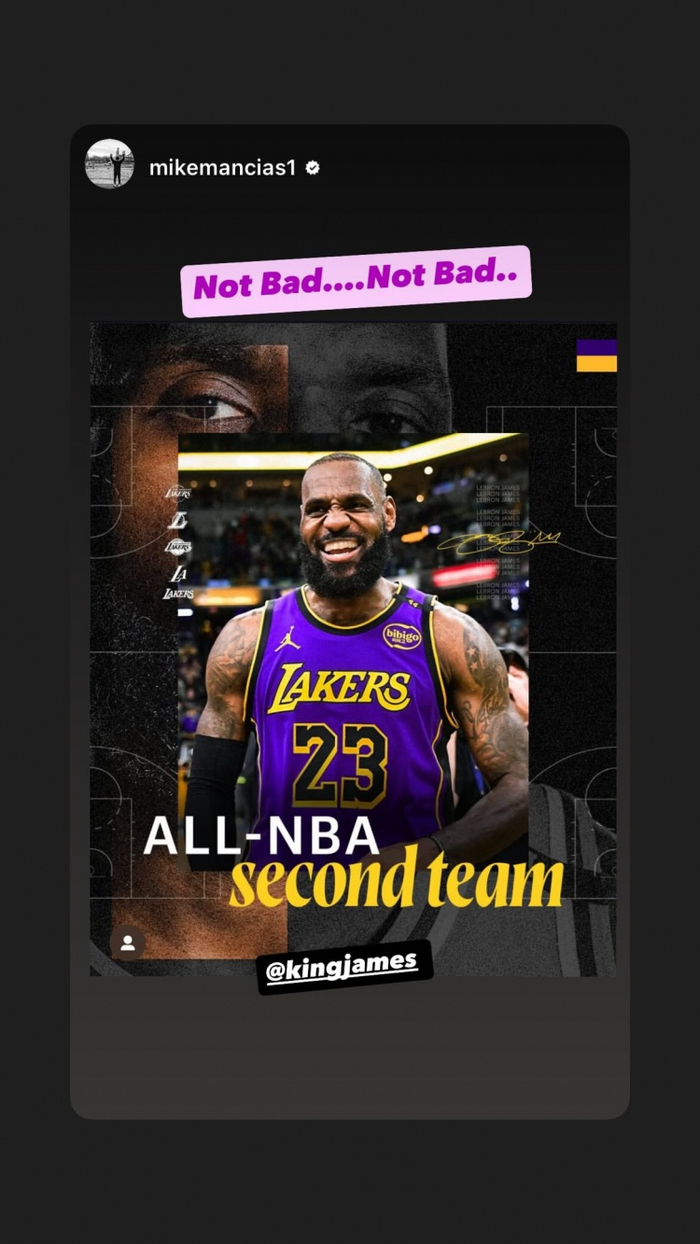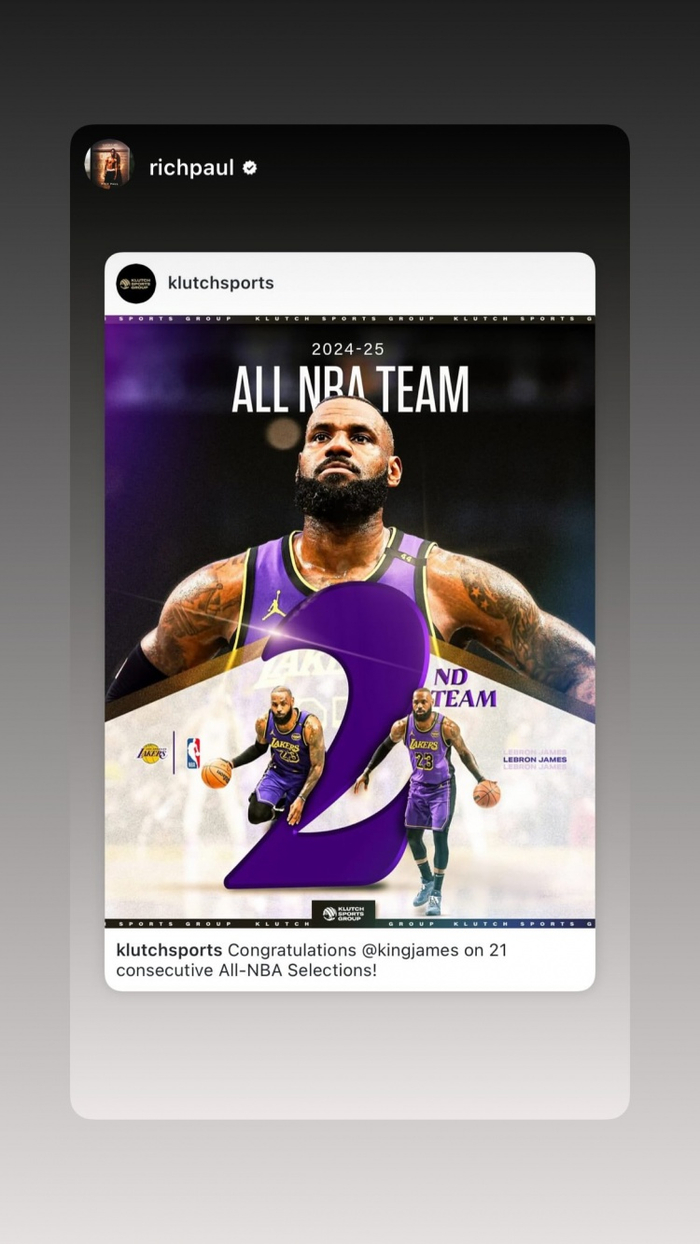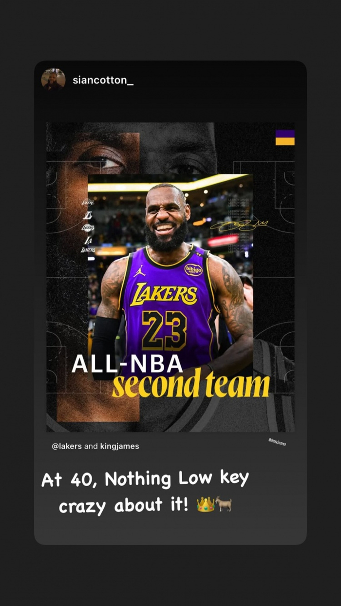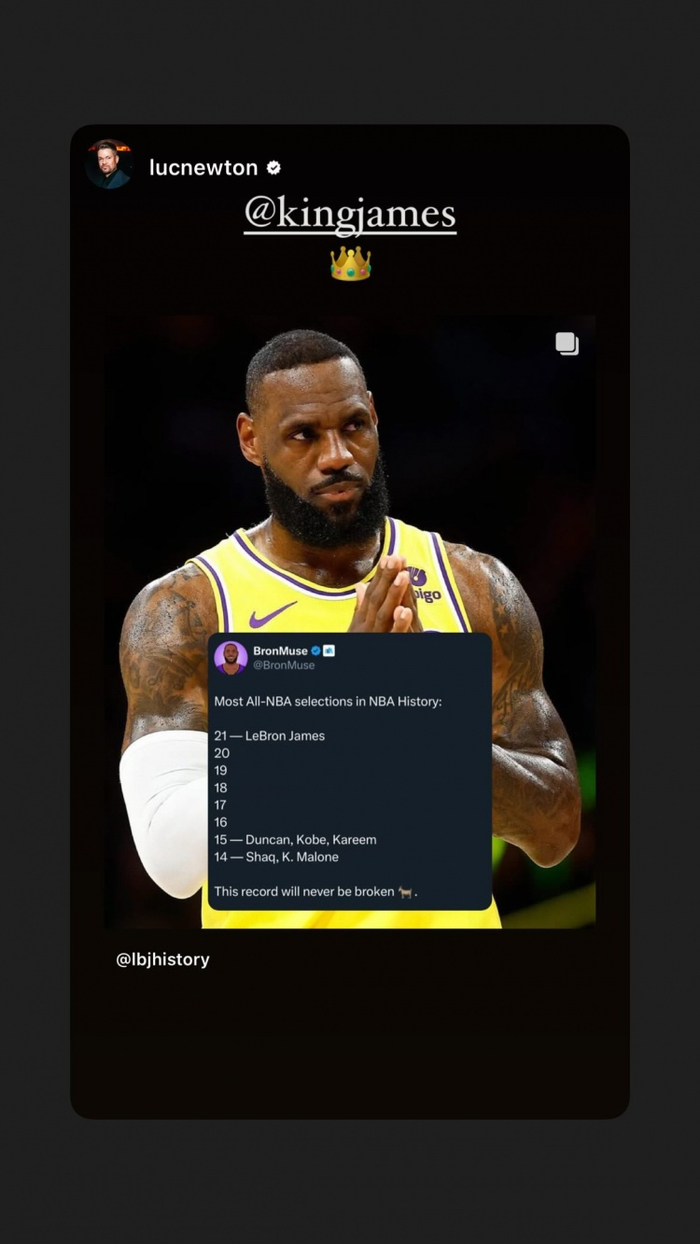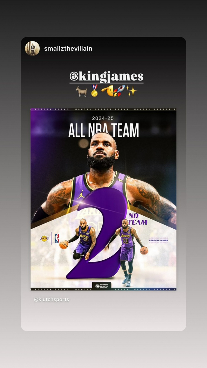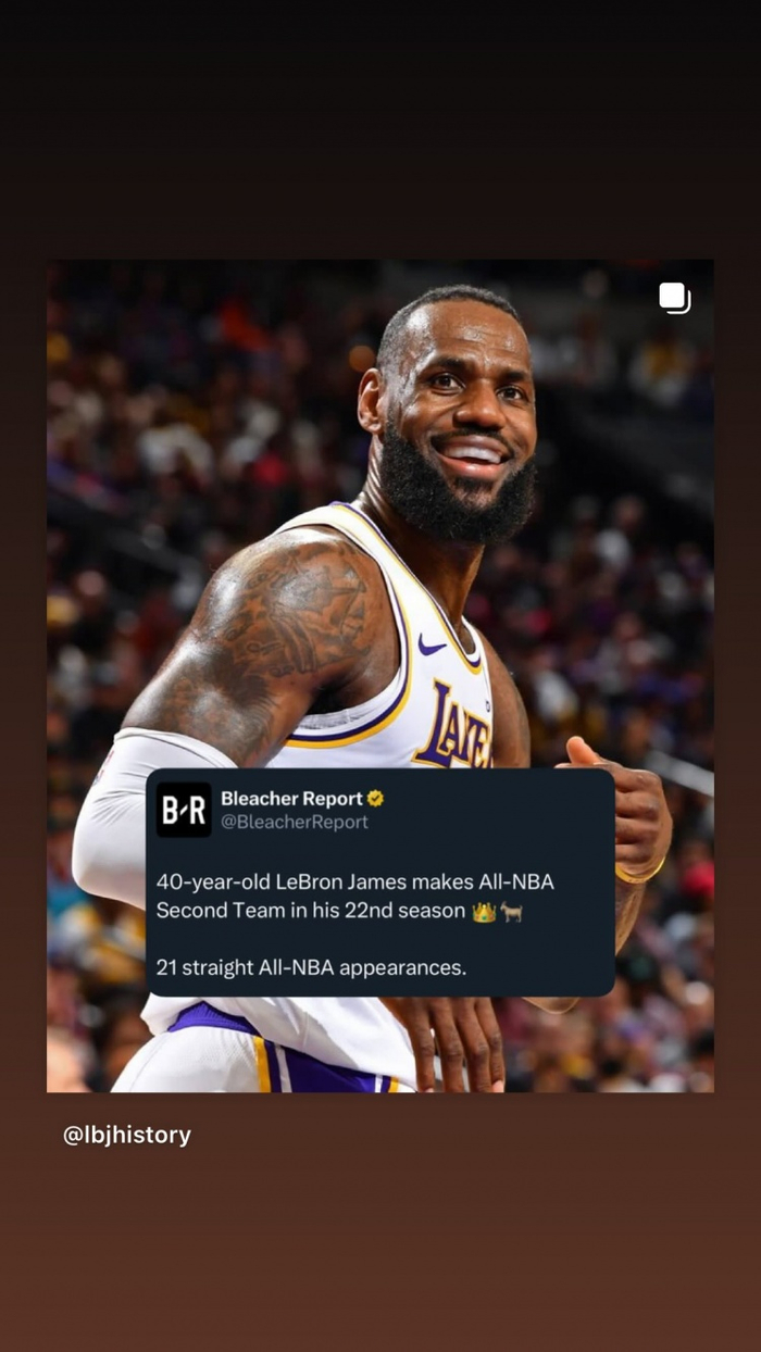 詹姆斯更新个人社交媒体,写道:“40岁再度入选最佳阵容!!此刻简直让我暗自疯狂!坐在这里看着季后赛,满脑子都是这个念头。这份幸福远远超乎我的想象!👑🙏🏾”