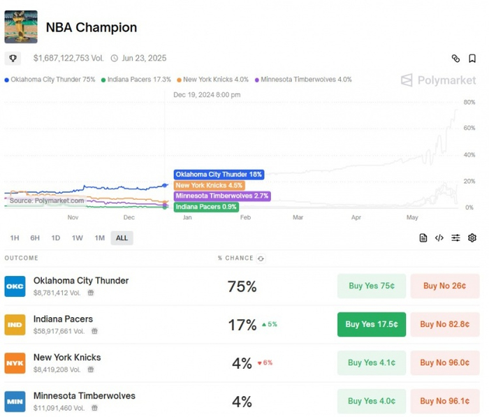 🏆NBA夺冠概率:雷霆75%碾压居首 步行者17% 尼克斯与森林狼4%