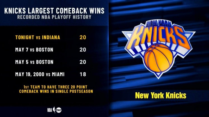 据统计,尼克斯本场曾35-55最多落后20分,最终完成逆转,追平了队史季后赛最大逆转分差,这也是他们第三次在季后赛完成20分逆转。