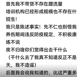 首先,柴长易点出“养伤期间违反防疫规定,不积极康复不训练不说,夜不归宿你们觉得出去干什么?(干什么去了我真不知道反正不是一天两天,我不造谣),后面我会说我知道的,比这严重多了。”