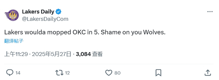 湖媒Lakers Daily:湖人五场之内就能搞定雷霆,森林狼你们真丢人啊。
