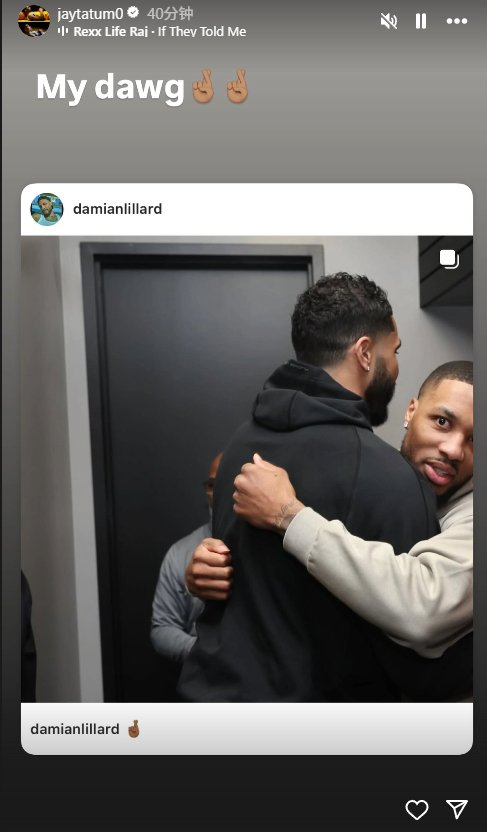利拉德配文:“🤞🏾”塔图姆转发了两人合照,并评论道:“我的兄弟🤞🏾🤞🏾”。