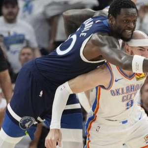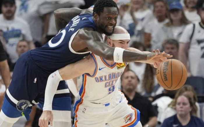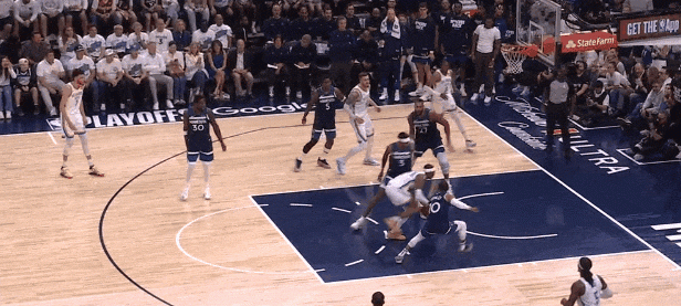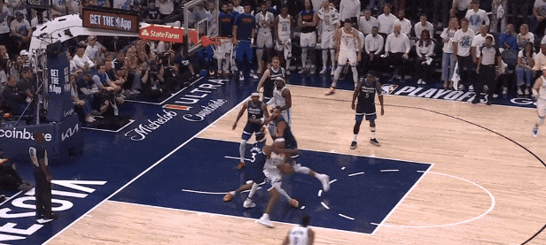 今天开场,雷霆半场紧逼,华兹和兰德尔都挨了夹击,于是开场第一攻就是戈贝尔:扣篮被切特盖了。之后戈贝尔回了切特一个尺寸精致、“居然没犯规也能盖下来”的封盖,但这是雷霆今天的意思: