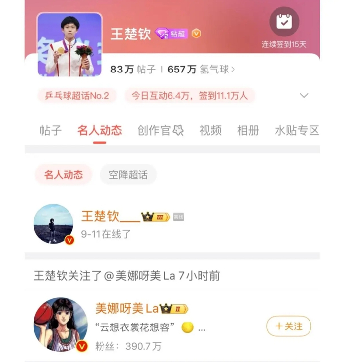 还有网友表示,根据美娜社媒更新的日常,发现她多次跟赛王楚钦。