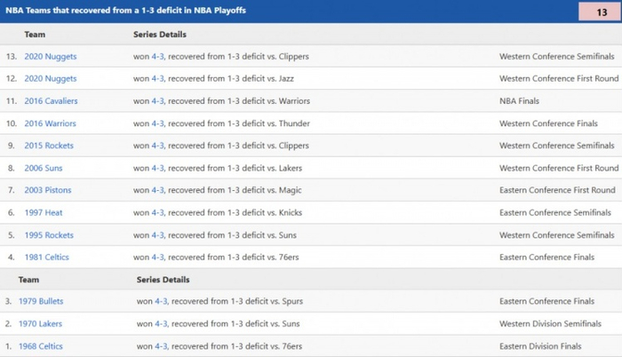 系列赛3-1晋级概率高达95.6% 此前283次出现仅13支球队实现翻盘