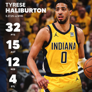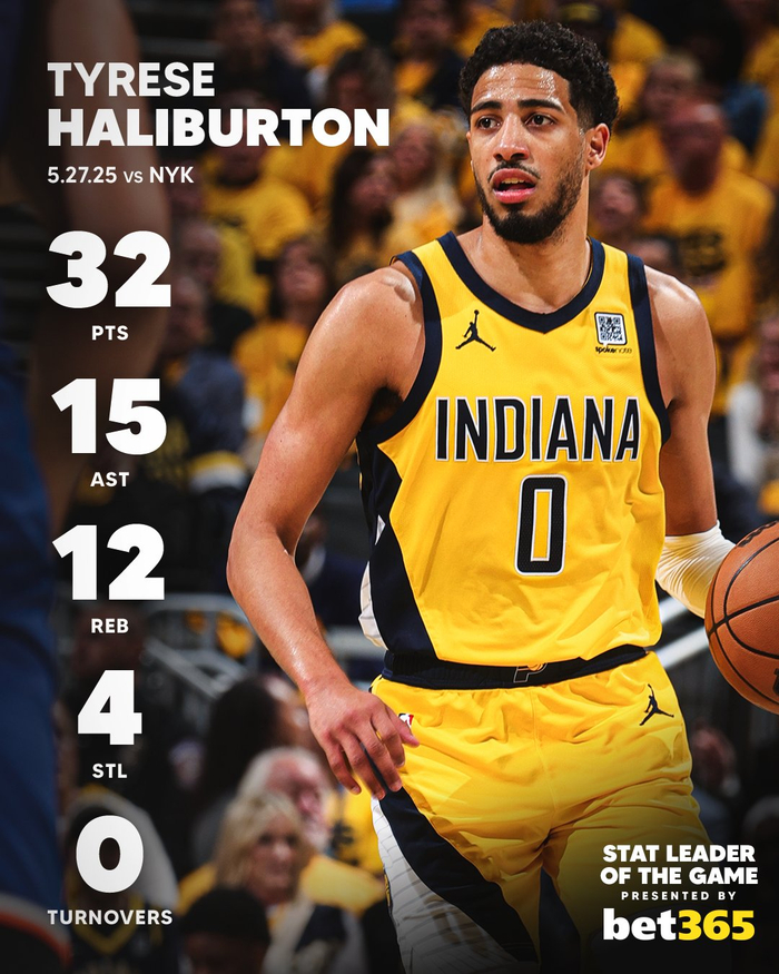 整场比赛,哈利伯顿上阵37分32秒23投11中,三分12中5、罚球6中5,砍下32分12篮板15助攻4抢断进账,零失误,正负值+16,得分创个人赛季季后赛新高,助攻平个人季后赛赛季最高,成为NBA季后赛史上首位单场至少30分10板15助0失误的球员。