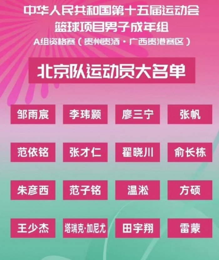 北京队全运会大名单:廖三宁、张帆、翟晓川、方硕、朱彦西在列