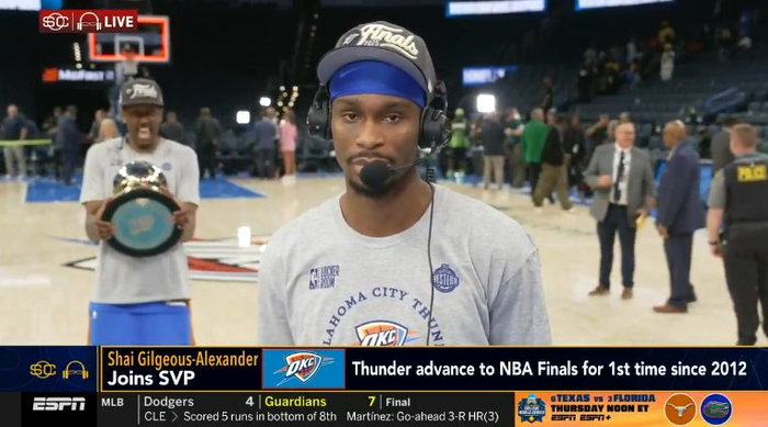亚历山大接受采访&杰伦威在后面抱着奖杯嘚瑟 SGA:走开啦😅!