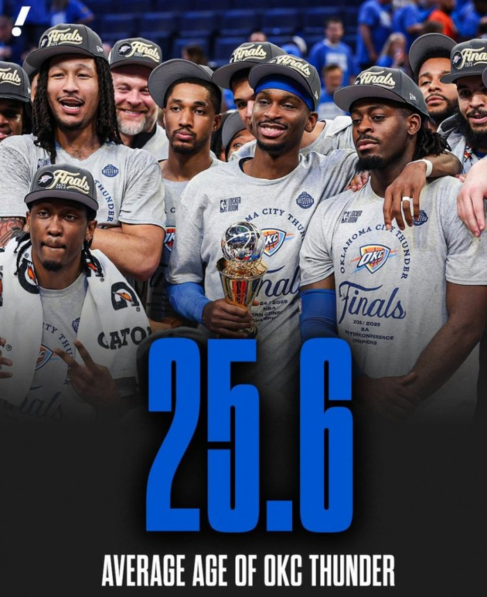 据统计,这支雷霆球员(仅统计出场球员)的平均年龄为25.6岁,若夺冠,他们将成为NBA历史上自1977年以来第二年轻的冠军球队,仅次于1977年的开拓者(25.05岁)。