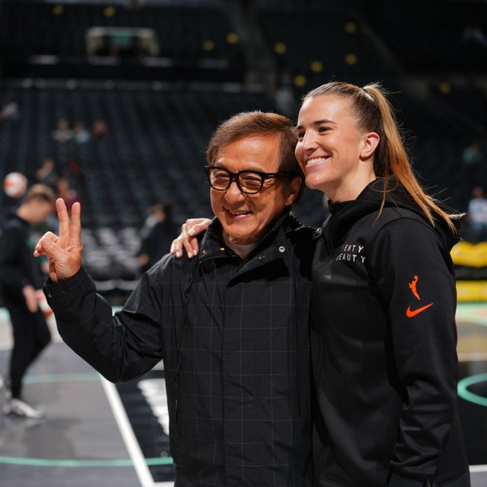 WNBA官方赛前晒出中国影星成龙与纽约自由人核心约内斯库的合照:约内斯库🤝成龙。