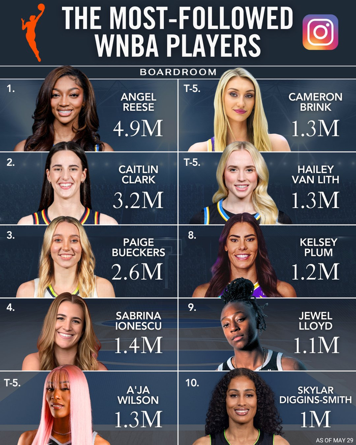 😍WNBA球星社媒粉丝前十:里斯490万断档第一 克拉克320万第二