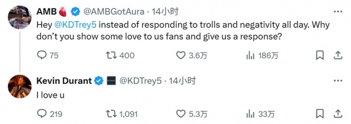 😍网友:KD别回复喷子了 向球迷们表达一些爱 杜兰特:我爱你