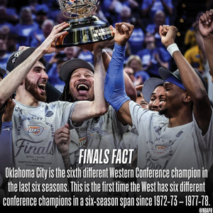 直播吧5月31日讯 本赛季雷霆夺得了西部冠军,这是联盟近6个赛季以来,所诞生的第6个西部冠军。