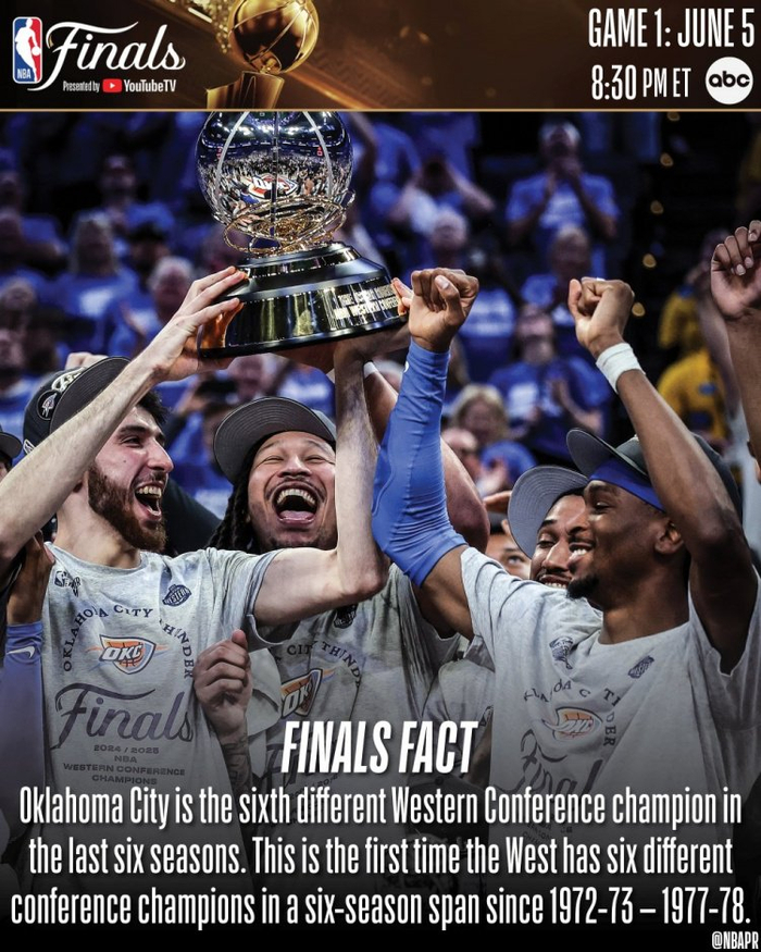 据统计,这是联盟自1972-73赛季至1977-79赛季以来,首次出现连续6个赛季出现6个不同的西部冠军的情况。