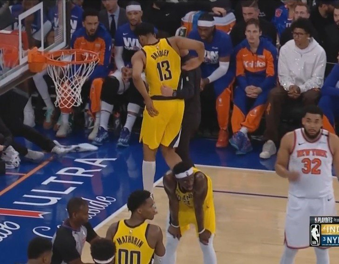 布拉德利在昨天G5的比赛中受伤离场。离场前出战5分22秒,得到2分2篮板。