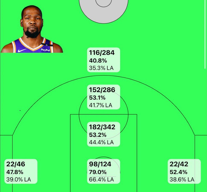 随后,网友附上一张杜兰特的投篮热图(如下图),并评论到:“我去。我真不知道你进化到这地步了。”