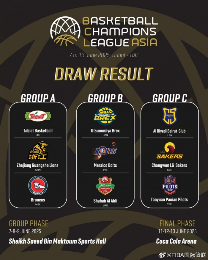 直播吧5月31日讯 2025FIBA亚洲篮球冠军联赛抽签结果今天出炉,广厦队被分入A组,同组的还有乌兰巴托野马队及塔比亚特队。