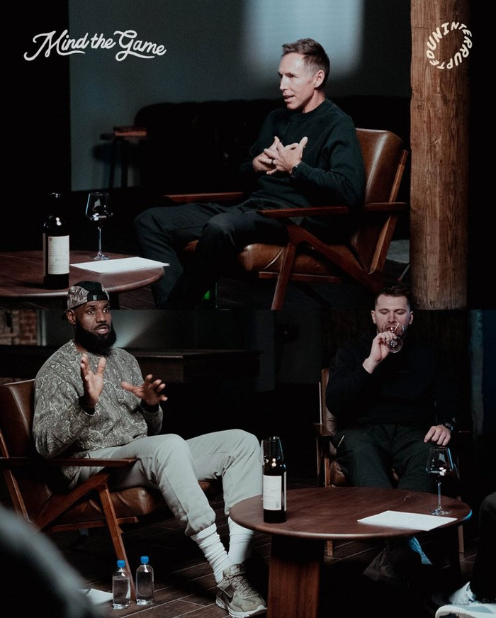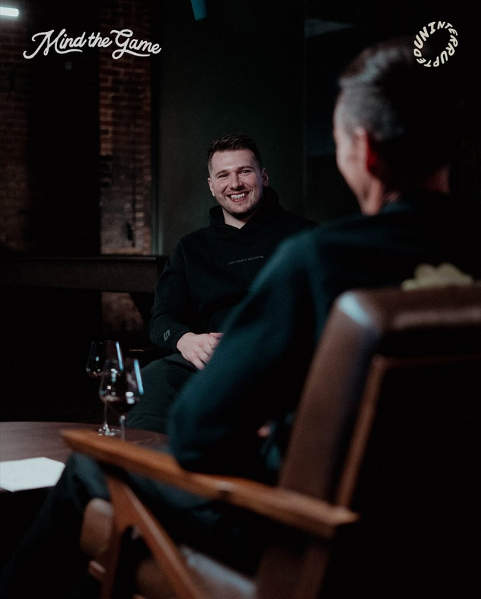 东契奇在这组花絮照中面带微笑,与两位节目主持人詹姆斯和纳什交谈着。