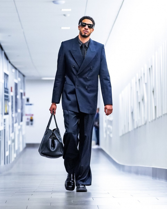 步行者球星哈利伯顿今天也穿了一身黑到场。