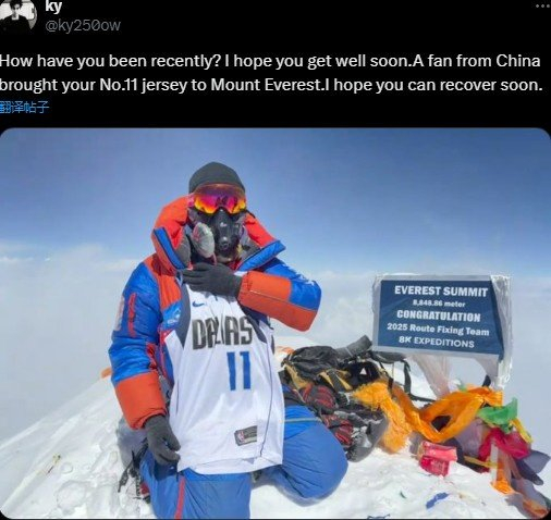 这位球迷在社媒多次联系了欧文,他写道:“欧文,你能看到我的新闻吗?一位中国球迷把你的11号球衣带到了珠穆朗玛峰,我是你忠实的粉丝。希望你早日康复。我希望得到你的回复!”