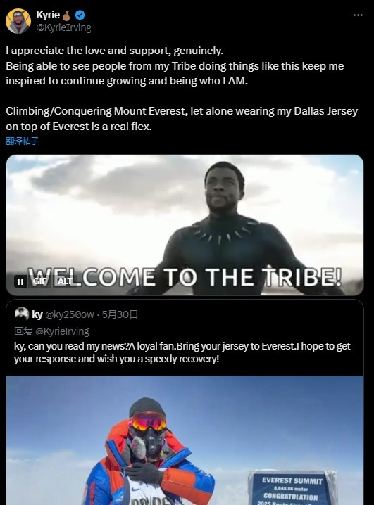 直播吧6月1日讯 独行侠球星欧文在社媒上回应了一位球迷,该球迷身穿自己的独行侠队球衣登顶珠峰。