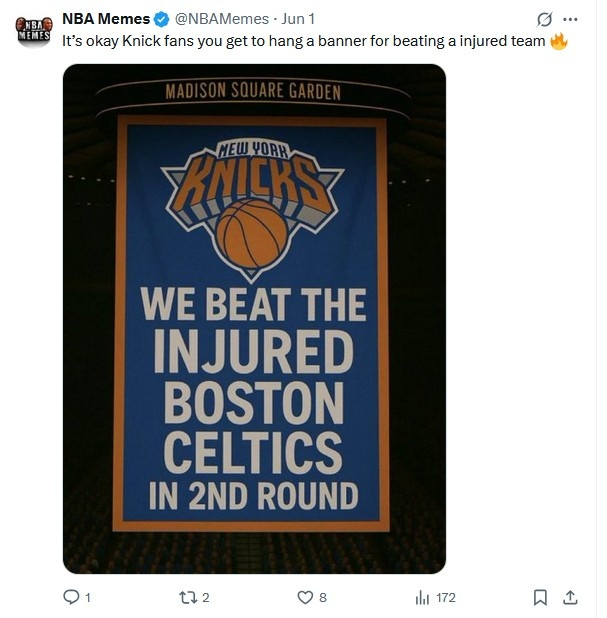 旗帜上印着尼克斯队徽,并写着:我们在季后赛次轮击败了(主将)受伤的凯尔特人。