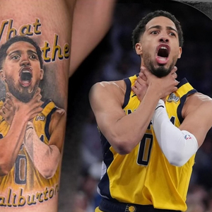 真爱粉😍步行者球迷在小腿上纹了哈利伯顿扼喉庆祝动作的纹身