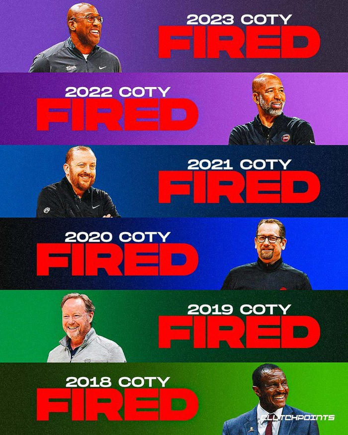 2018-2023年的年度最佳教练分别是:凯西(猛龙)、布登(雄鹿)、纳斯(猛龙)、锡伯杜(尼克斯)、蒙蒂(太阳)、迈克-布朗(国王),这些教练在拿奖之后都难逃被炒的命运。