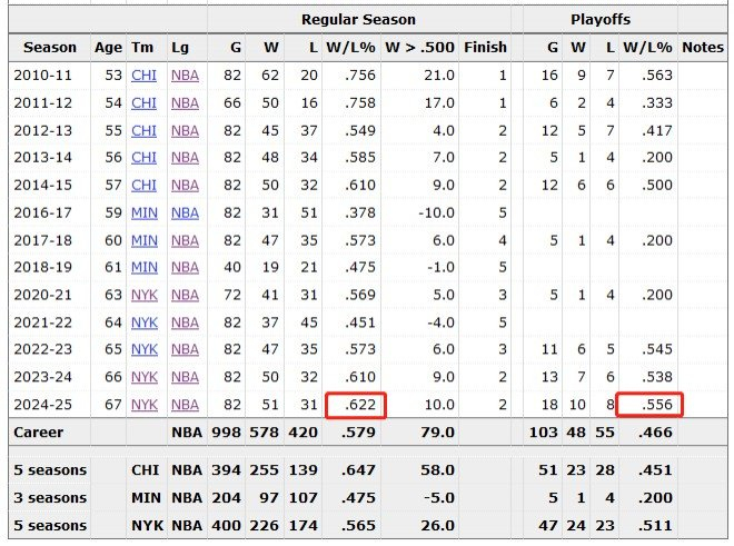 尼克斯本赛季季后赛的胜率55.6%则是生涯第二好,仅次于他在公牛的第1个赛季。
