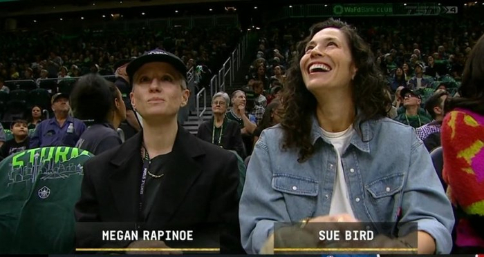 值得一提的是,西雅图风暴队传奇球星苏-伯德今天携未婚妻、前美国女足队长拉皮诺埃来到了现场观战。