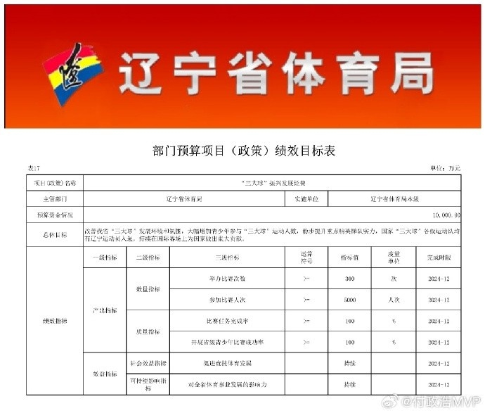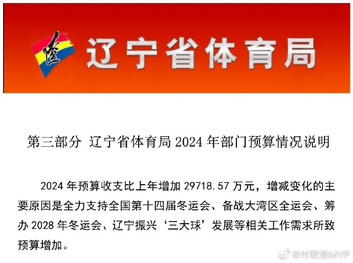 原文写道:“辽宁省体育局曾对2024年部门预算增加2.9718亿元做出说明,增加的部分是要用于备战十四冬、十五届全运会、筹办十五冬和振兴三大球这四块。其中,三大球振兴发展经费为1亿元。辽篮专门设立振兴三大球发展经费,这扶持力度不可谓不大。”