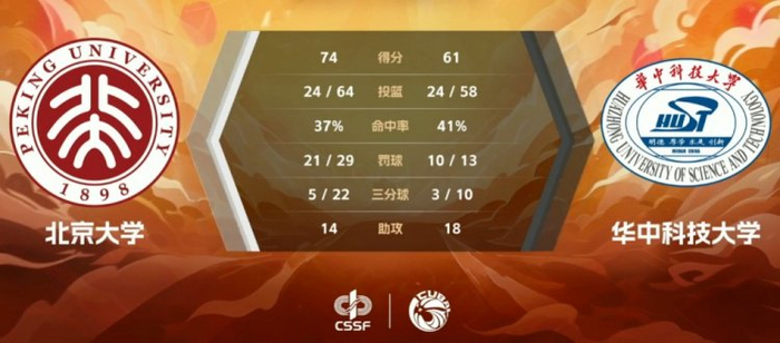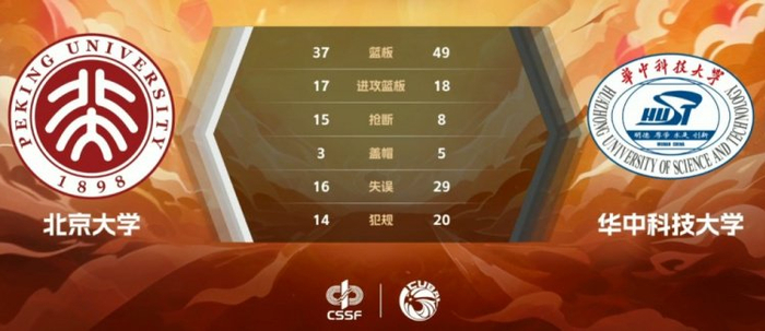华中科技大学:杨谭玥影16分4篮板4助攻、高建军10分10篮板4助攻、刘贝13分7篮板4助攻3抢断、王姝心7分14篮板2助攻2抢断4封盖、张博雅7分2助攻。
