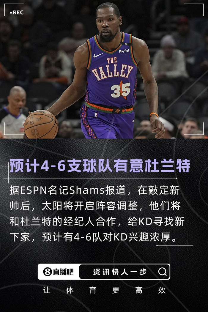 可和新队签两年1.11亿👀Shams:预计4-6支球队对杜兰特兴趣浓厚