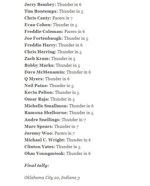直播吧6月5日讯 ESPN的23位专家和记者对总冠军的归属给出了预测,其中有20人支持雷霆夺冠,只有3人看好步行者夺冠。