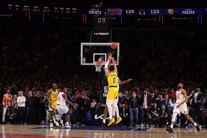 篮球悬停在空中,宛如卢浮宫墙上悬挂的油画。它对抗着重力,弹得如此之高,以至于TNT电视台的广角转播镜头中都失去了它的踪迹。与其说是油画,不如说更像一颗流星,转瞬即逝。但与那些天体岩石不同,这颗更接地气的球总会回落。当篮球最终以不可思议的角度坠落,刷网而入扳平东部决赛G1的比分,它成为了贯穿整个季后赛的定理最新佐证:泰瑞斯-哈利伯顿已正式跻身联盟前5巨星之列。