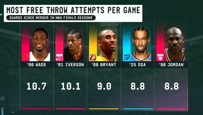 杀入总决赛后卫当赛季罚球Top5:韦德10.7次居首 SGA第4 乔科在列