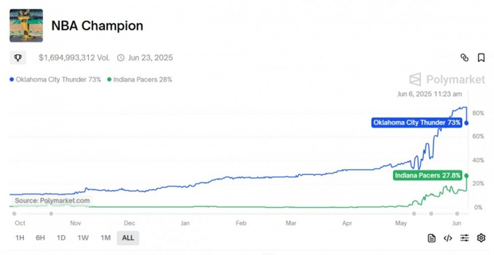 据数据媒体Polymarket Hoops更新了夺冠概率,雷霆有所下降但仍高达73%,步行者为27%。