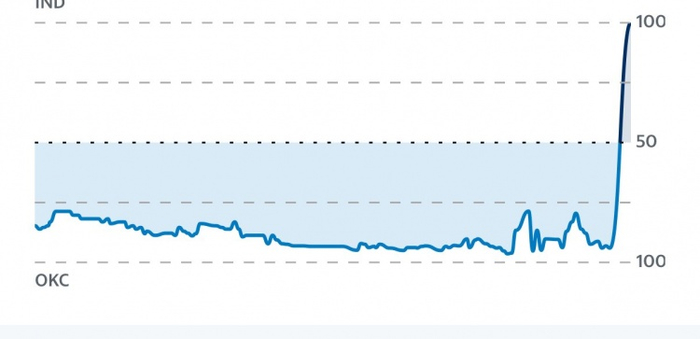 本场比赛的取胜概率曲线步行者全场都不占优,最后时刻雷霆更是接近100%,但步行者最终完成了两极翻转。