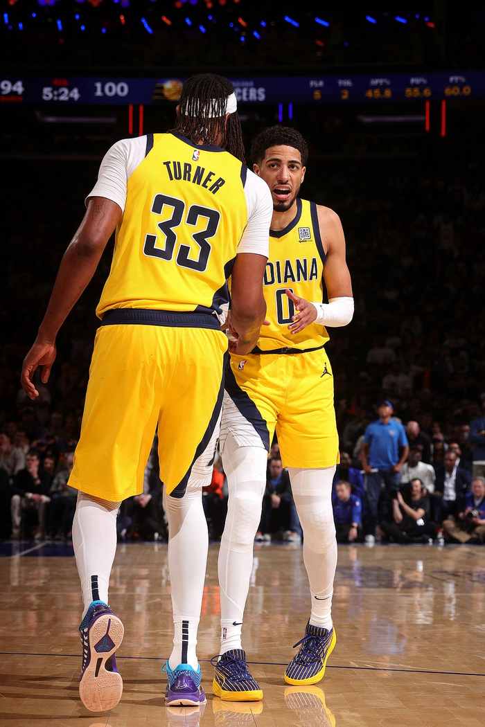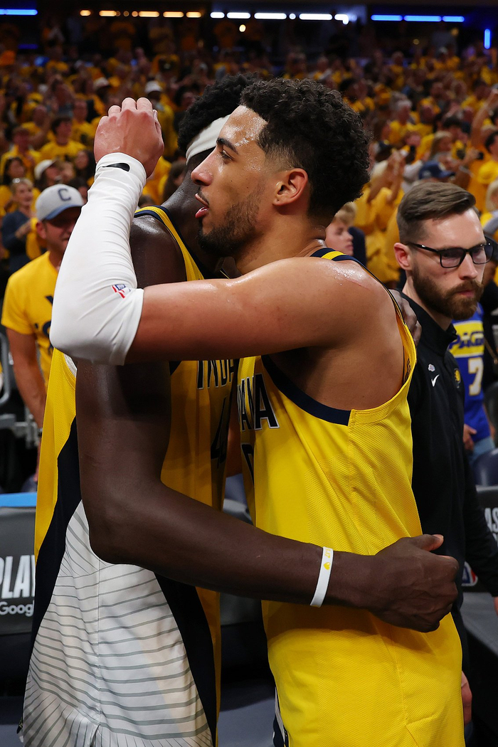 在哈利伯顿的带领下。如果说本届季后赛有一位横空出世的明星,那就是哈利伯顿,他带领球队完成了历史性的逆转,命中了不可思议的出手,而且是步行者队自2000年以来首次闯入总决赛的引擎。在对阵尼克斯队的第六场比赛终场哨声响起后,哈利伯顿和西亚卡姆紧紧拥抱在一起。