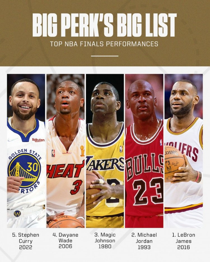 帕金斯评历史TOP5总决赛表现:16詹姆斯第1 93乔丹次之 22库里第5