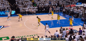 比赛关键时刻,步行者后卫、加拿大球员安德鲁-内姆哈德迎着雷霆球星、国家队队友亚历山大的防守,命中三分将分差缩小到3分。