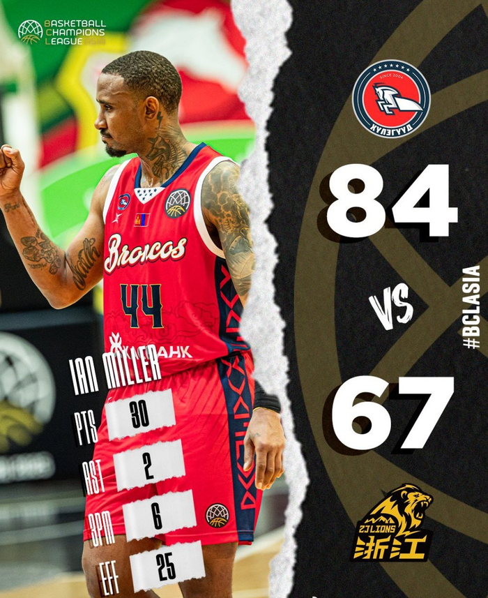 野马这边,外援伊恩-米勒17投9中,三分12中6,罚球6中6,爆砍全场最高的30分。蒙古球员楚伦巴特尔10投6中,三分4中2,罚球4中4,得到18分。