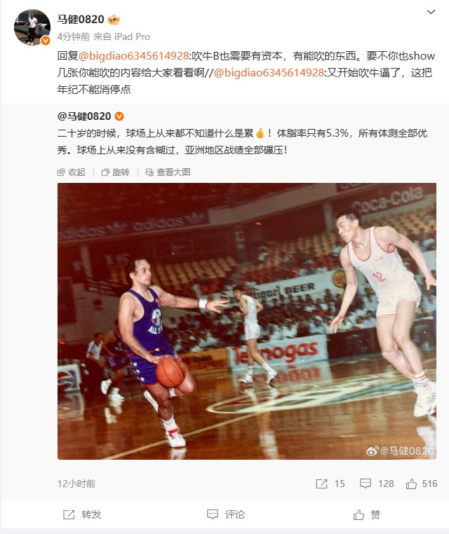 直播吧06月08日讯 前男篮国手、现篮球评论员马健更新个人社交媒体,回忆起往昔的峥嵘岁月。