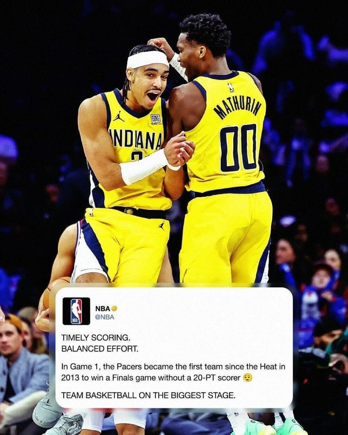 本场比赛,步行者没有球员得分20+但仍然取胜,NBA总决赛自2013年的热火以来首次。