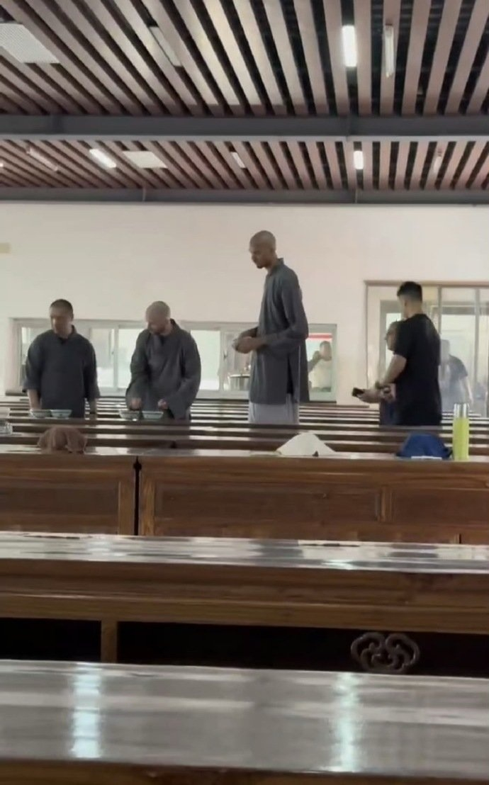 直播吧6月8日讯 近日咪咕体育社媒晒出一张照片,马刺球星文班亚马参观嵩山少林寺时剃了光头,享用斋饭。