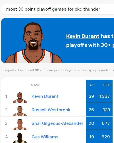亚历山大跃至第三!雷霆队史季后赛30+场数排名 KD第一&威少第二