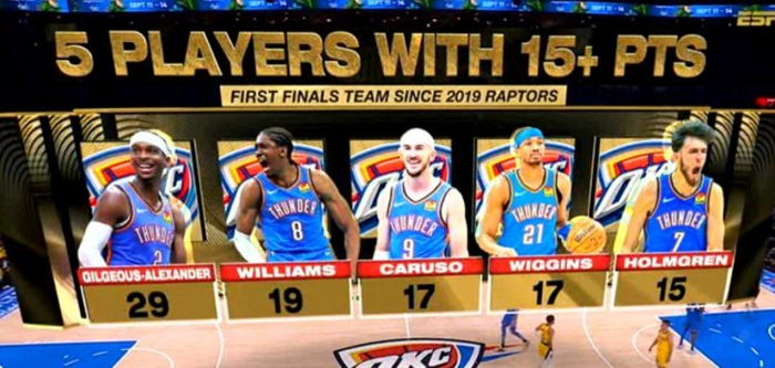 西卡都在现场!雷霆全队5人得分15+ NBA历史自19年猛龙后首队