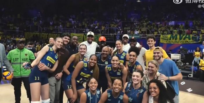 直播吧6月9日讯 今日,雄鹿球星字母哥携哥哥萨纳西斯(左二)、弟弟科斯塔斯(右一)、亚历克斯(左一)还有母亲前往巴西,观看了2025世界女排联赛分站赛第一周巴西女排vs意大利女排的比赛,赛后还与女排队员亲切合影。