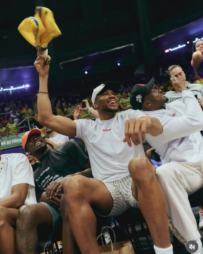 一大家子全去了!字母哥带三个兄弟和母亲去巴西观看女排比赛